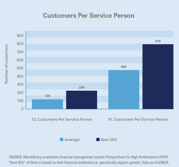 Solution: Before dismissing this concern, it’s important to examine the average book size of your service staff and how it compares to the rest of the industry. The chart shows that the average commercial lines service person serves about 126 customers, while employees in top firms serve closer to 236 customers on average. The difference is even more striking on the personal lines side, where staff in top firms serve twice as many customers as in average firms.