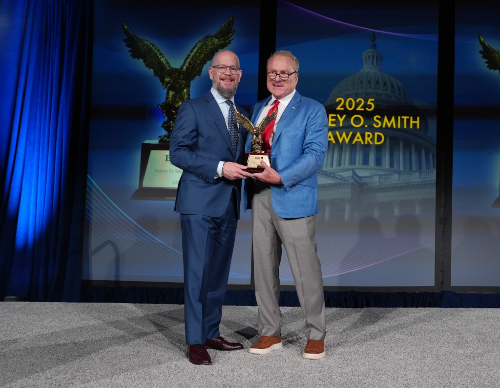 During the Big “I” Legislative Breakfast on Thursday, Jim Murphree, Big “I” government affairs chair and president of Jim Murphree Insurance Agency in Oneonta, Alabama, presented Frank Jones, partner at Mints Insurance, Millville, New Jersey with the 2025 Sidney O. Smith Award.
