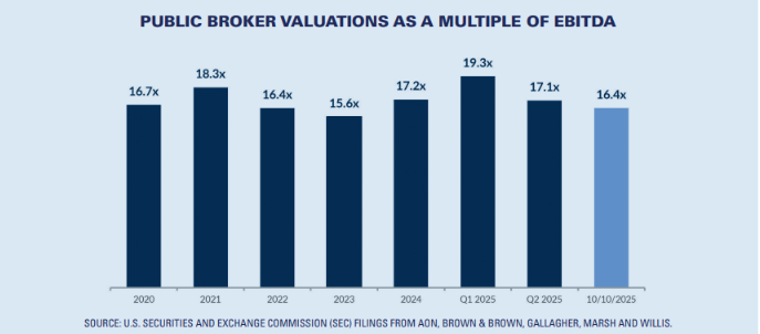 Third-quarter earnings have yet to be released for any firm. Still, valuations through September show that public broker multiples have come down even further to 16.4x LTM EBITDA, the lowest level since 2023.